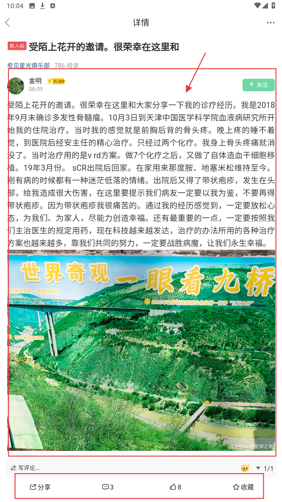 3、查看帖子详情时,可浏览文字与图片内容,还能进行【分享】【评论】【点赞】【收藏】操作。