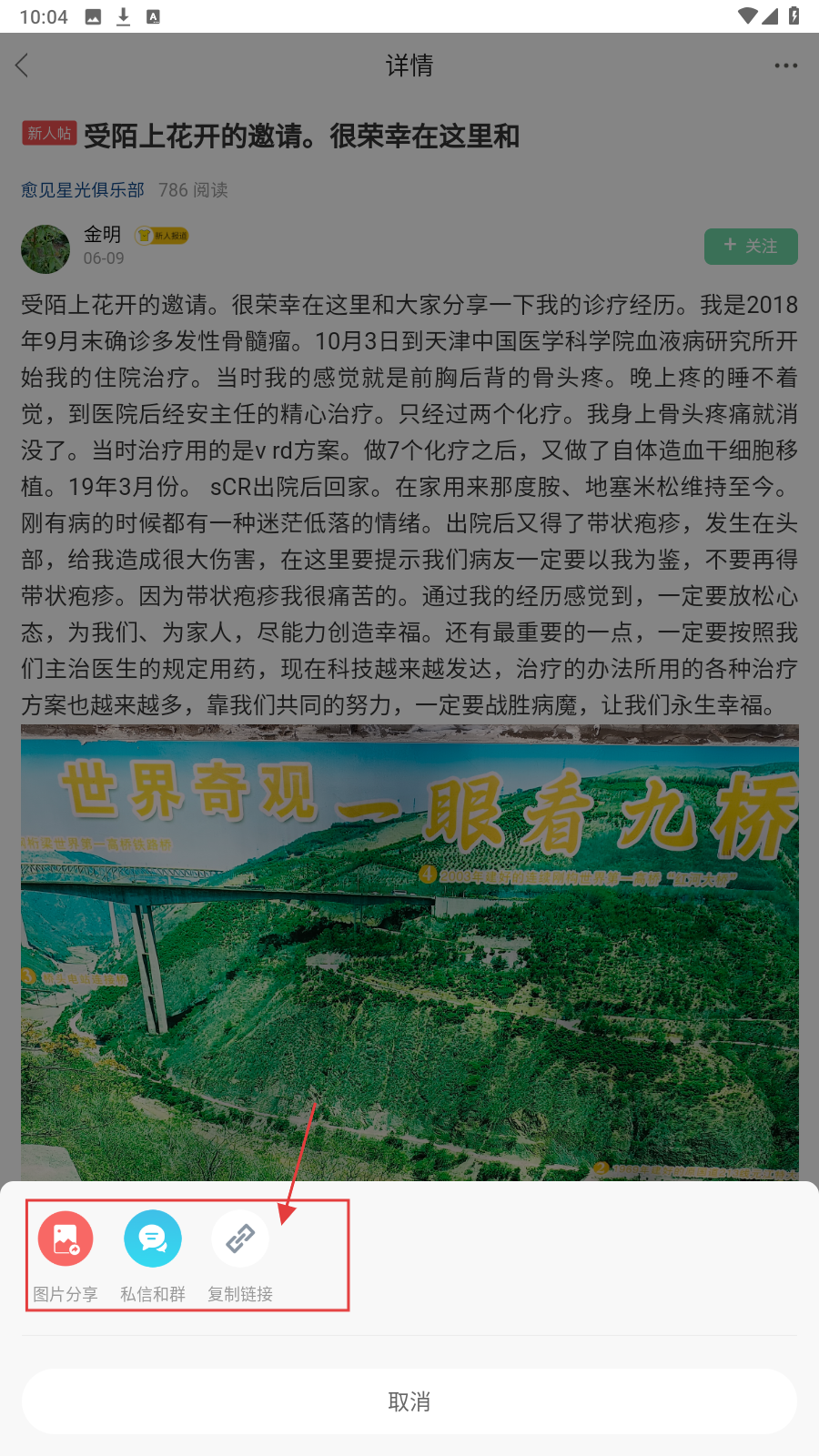 4、点击【分享】后,可选择【图片分享】【私信和群】【复制链接】等方式分享帖子。