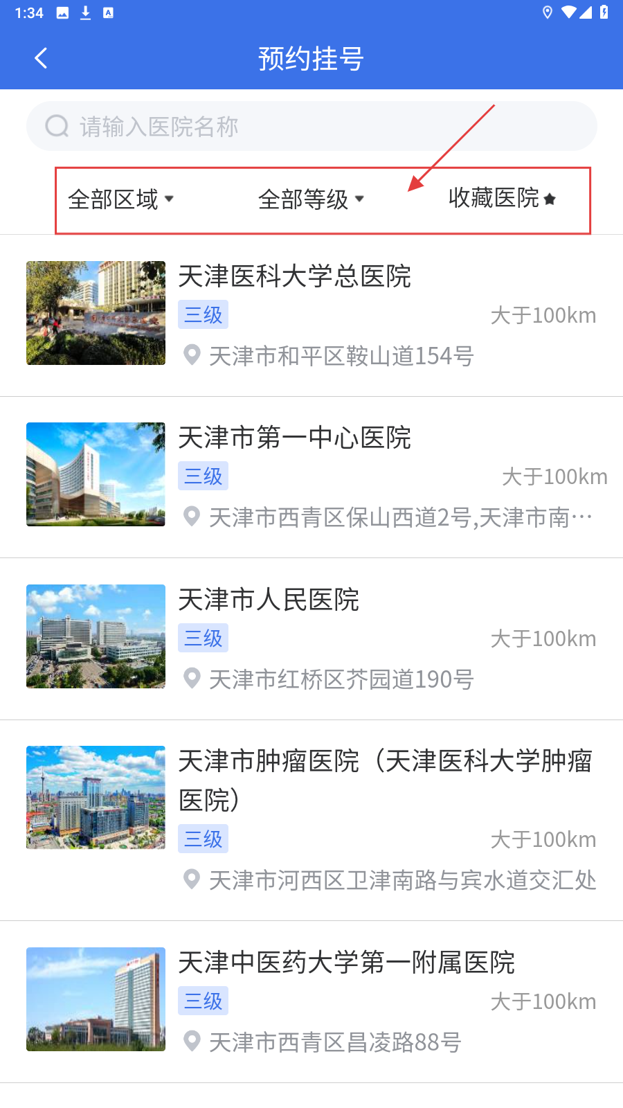 2、在【预约挂号】页面可以按照区域、等级、收藏医院等筛选医院,选择想去的医院并点击。