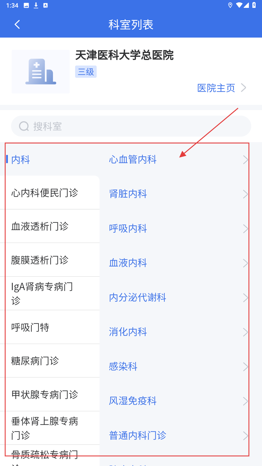 3、进入医院页面,选择需要去的科室,如【呼吸内科】。