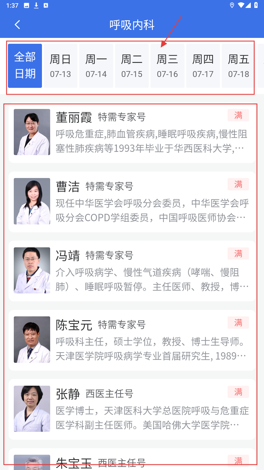 4、进入【呼吸内科】界面后,按需选择日期及医生进行挂号即可。