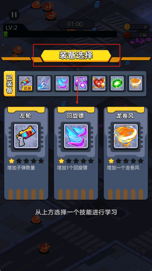 4、如何学习技能?倒计时01:00升至LV2,在装备选择界面点击“左轮”“回旋镖”或“龙卷风”之一即可学习。