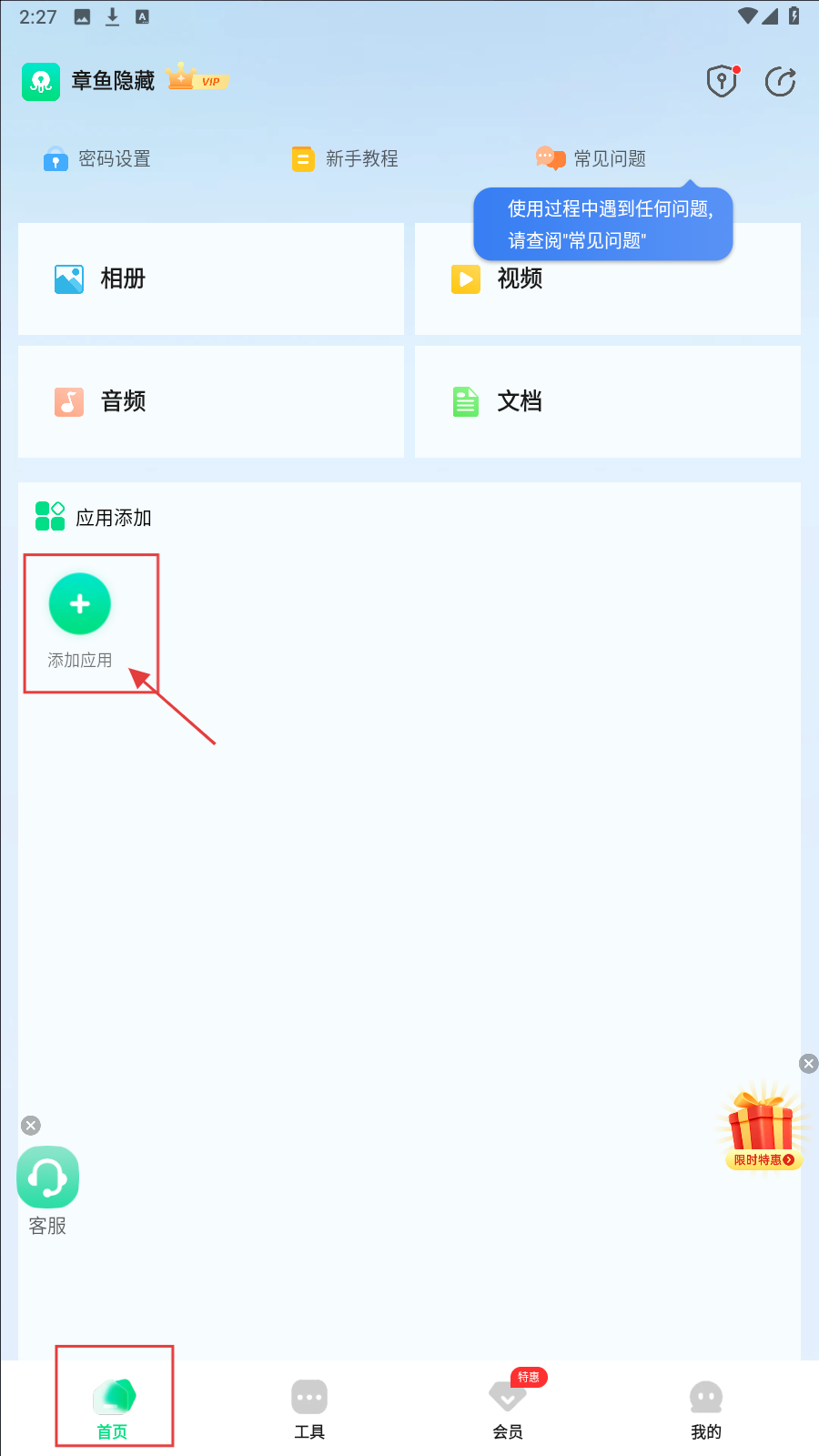 1、在【首页】界面,点击【添加应用】,可开启应用隐藏相关流程,按提示操作即可。