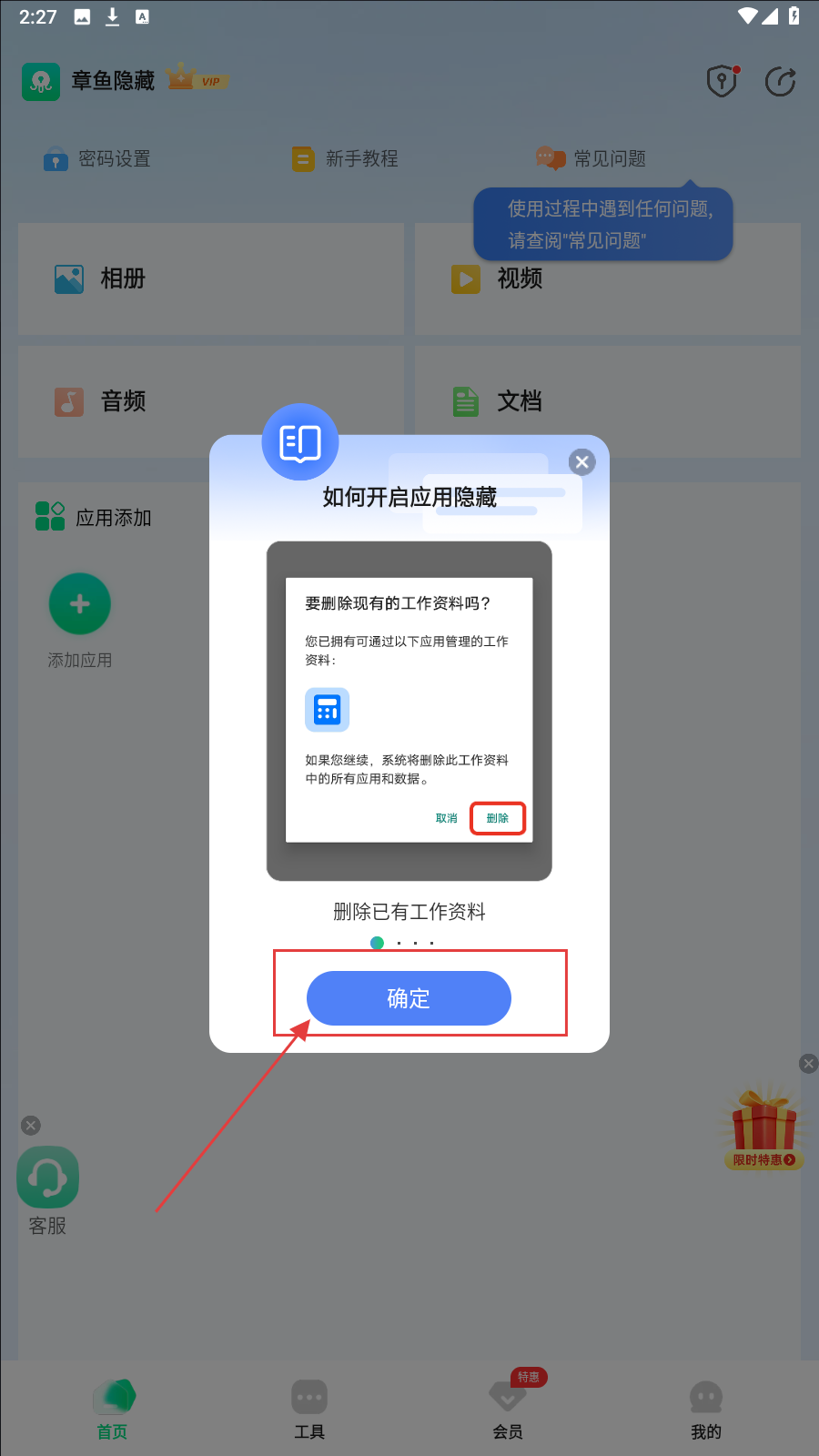 2、在弹出的提示框中,点击【确定】,删除已有工作资料,以便进行后续操作。