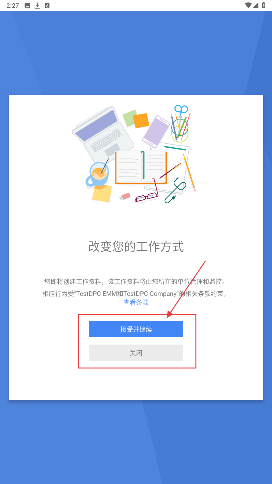 3、在创建工作资料页面,点击【接受并继续】,开启工作资料创建流程。