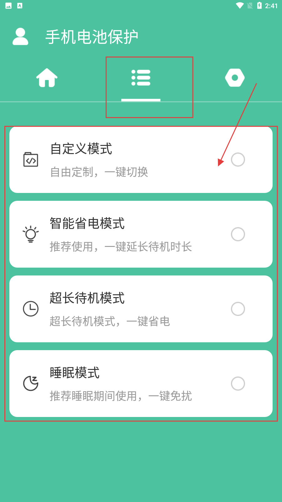 4、在模式选择页面,可选择【自定义模式】【智能省电模式】等,根据需求设置电池使用模式。