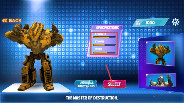 1、在机器人选择界面,可以查看力量、耐力、速度基础苏醒,点击【SELECT】选择心仪机器人进行战斗。