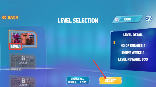 2、进入关卡选择界面,选择【LEVEL1】,查看关卡详情(敌人数量、波次、奖励)后,点击【SELECT】进入关卡。
