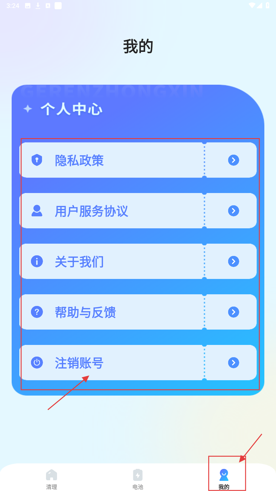 4、在【我的】页面,可查看【隐私政策】【用户服务协议】等信息,了解相关内容。