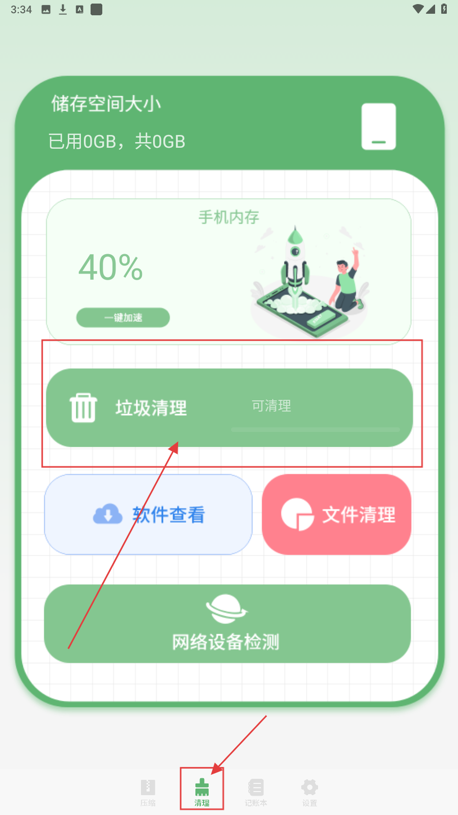 1、在清理页面,点击【垃圾清理】,可清理垃圾文件,释放手机空间。