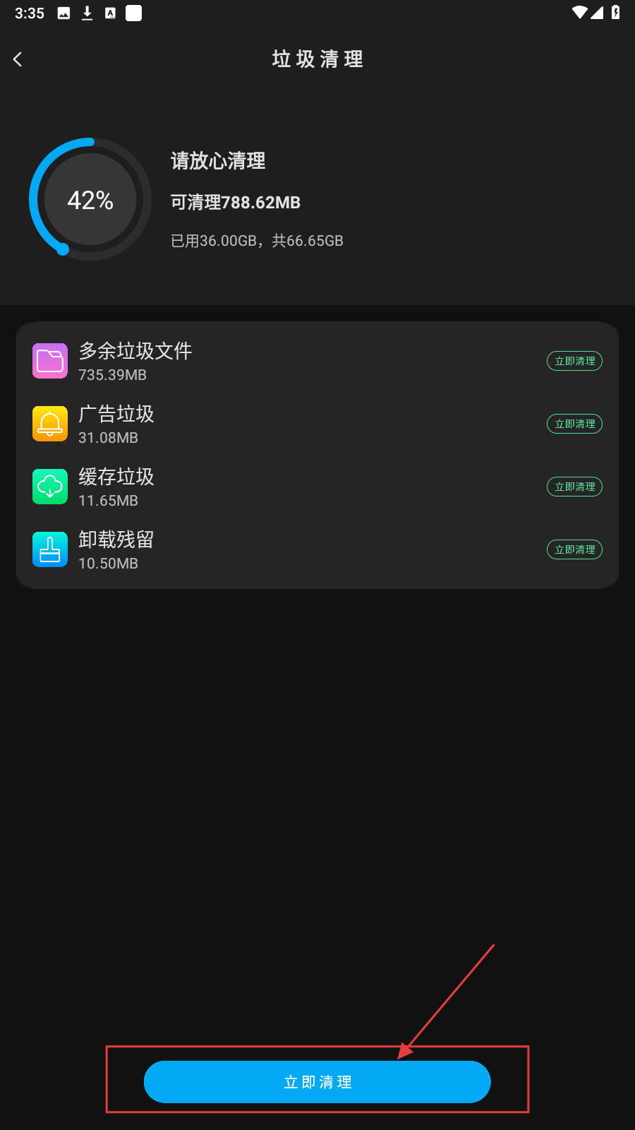 2、在【垃圾清理】页面,点击【立即清理】,可清理所有垃圾文件。
