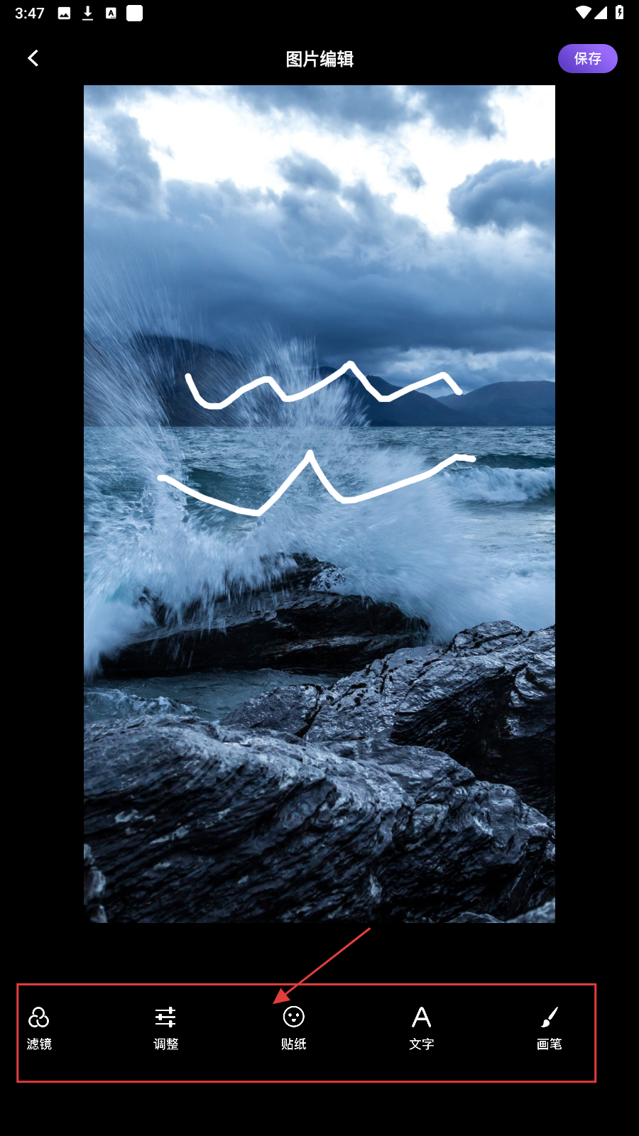 1、在【图片编辑】页面,可使用【滤镜】【调整】【贴纸】等功能,对图片进行编辑。