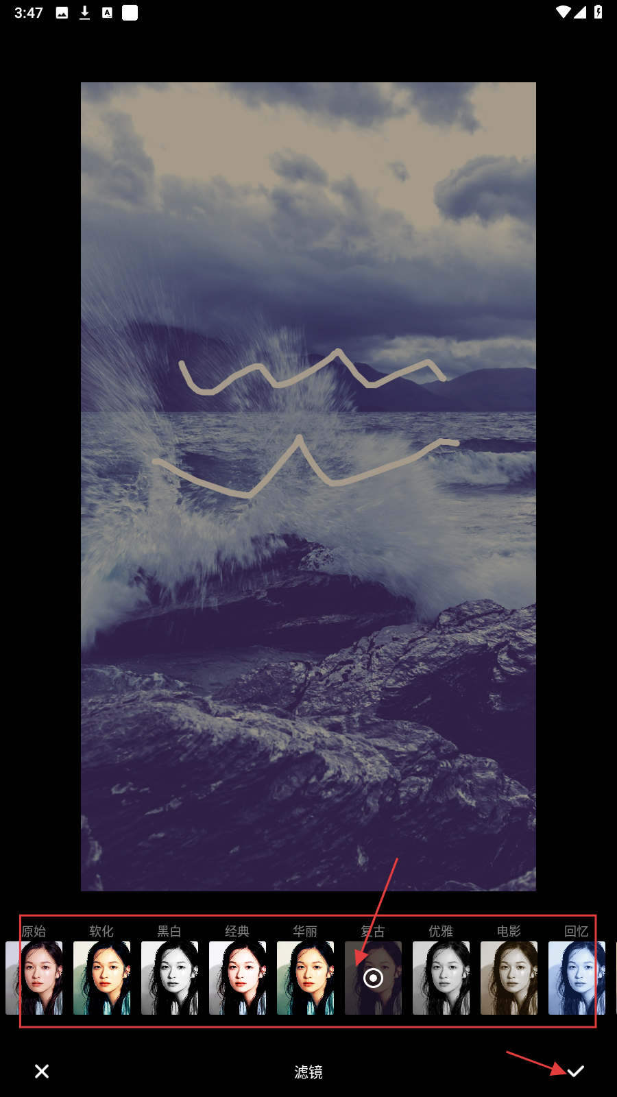 2、在【滤镜】选择页面,可选择不同的滤镜效果,点击右下角【√】可应用滤镜。