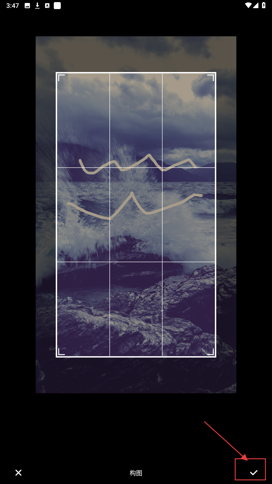 3、在【构图】调整页面,可调整图片的构图比例,点击右下角【√】可应用构图设置。