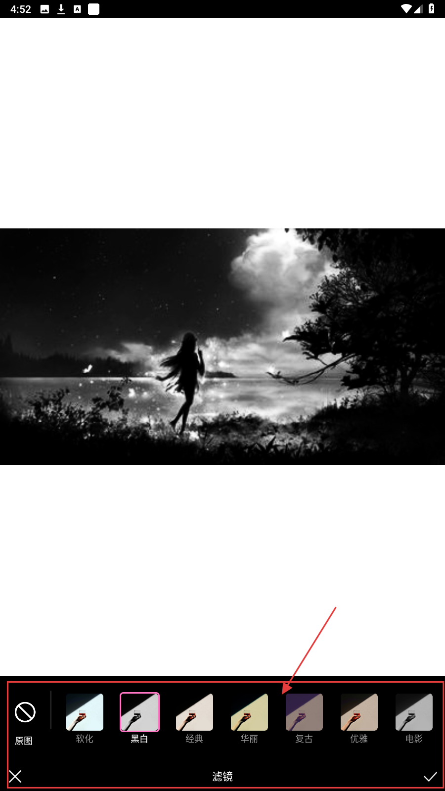 3、在滤镜选择页面,像【黑白】【经典】这类滤镜效果都有,可添加到图片上。