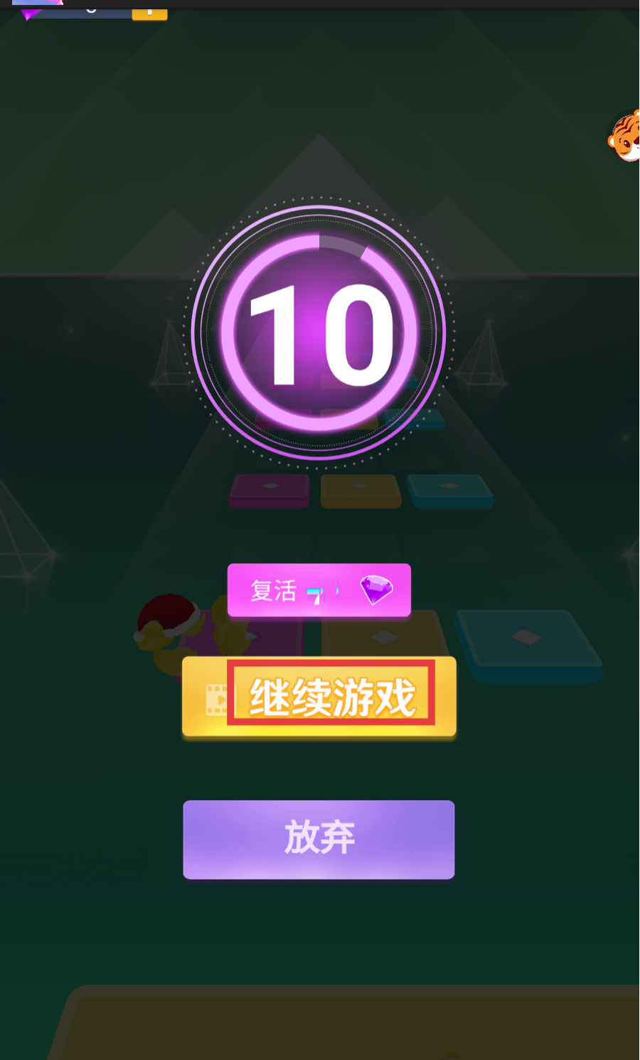 3、尽量保持小球在平台上,避免掉落。若出现倒计时界面,可点击【继续游戏】按钮(或使用钻石复活)来延续游戏进程。