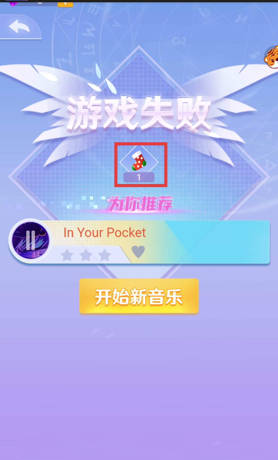 4、游戏失败后,查看获得的奖励(如圣诞袜道具),可以点击【开始新音乐】按钮,选择其他歌曲重新开始游戏。