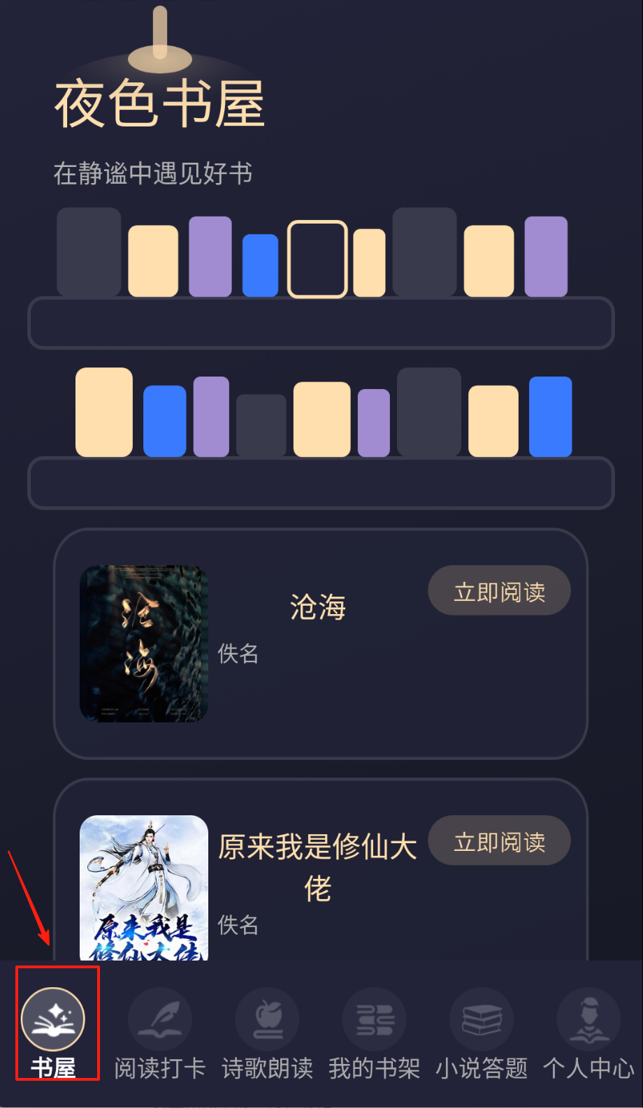 1、首页点"书城"浏览推荐书目,红点标注新书上架,按分类筛选,查看书籍详情哦。