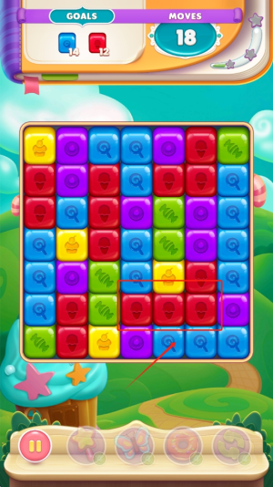 2、查看目标:进入关卡后,先看“GOALS”与初始步数“MOVES 18”,了解通关条件。