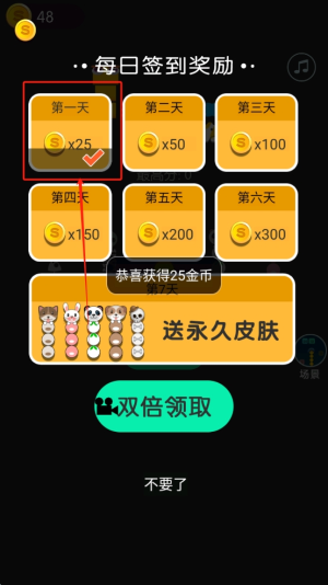 2、每日签到:在签到界面点击“双倍领取”领取25金币奖励。