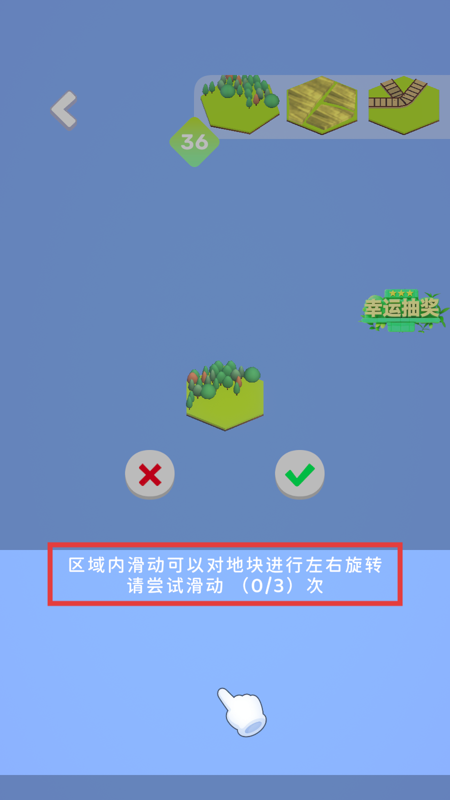 1、按照提示在区域内滑动,完成【0/3】次地块左右旋转操作,熟悉游戏的操控的方式呢。