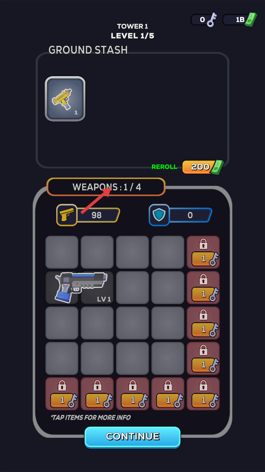 4、在快进入下一关,进入装备装备阶段,目前的等级只能放4件武器,下方解锁后的地方放置新武器,下一关即可用新武器攻击。