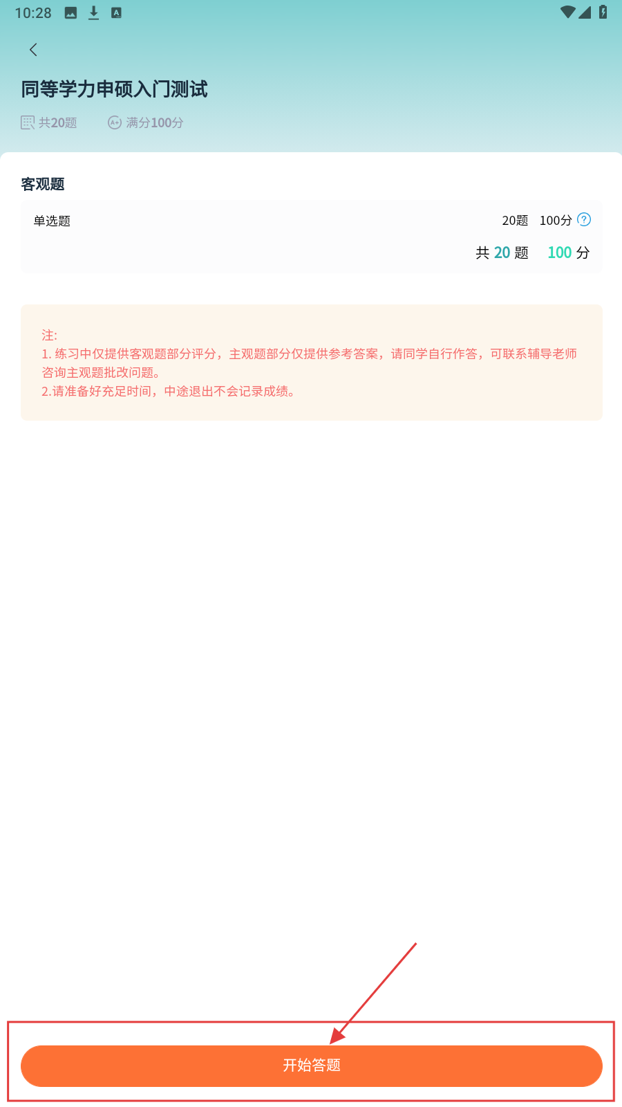 1、在【同等学力申硕入门测试】界面,点击【开始答题】按钮,即可进入答题环节,开启测试之旅。