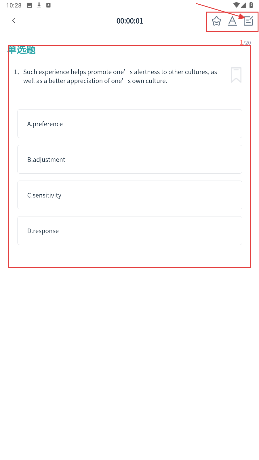 2、在答题页面,可看到单选题题目及选项,注意合理安排答题时间,认真思考后选择正确答案。