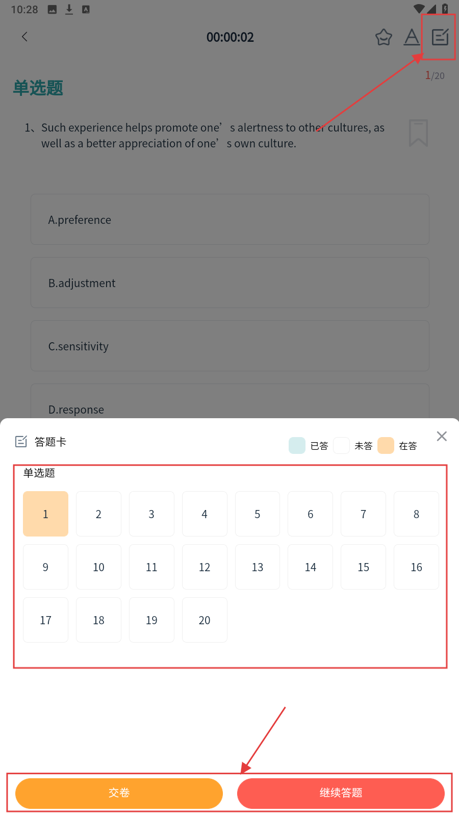 3、点击右上角图标,可查看【答题卡】,了解答题进度,合理规划剩余答题时间。
