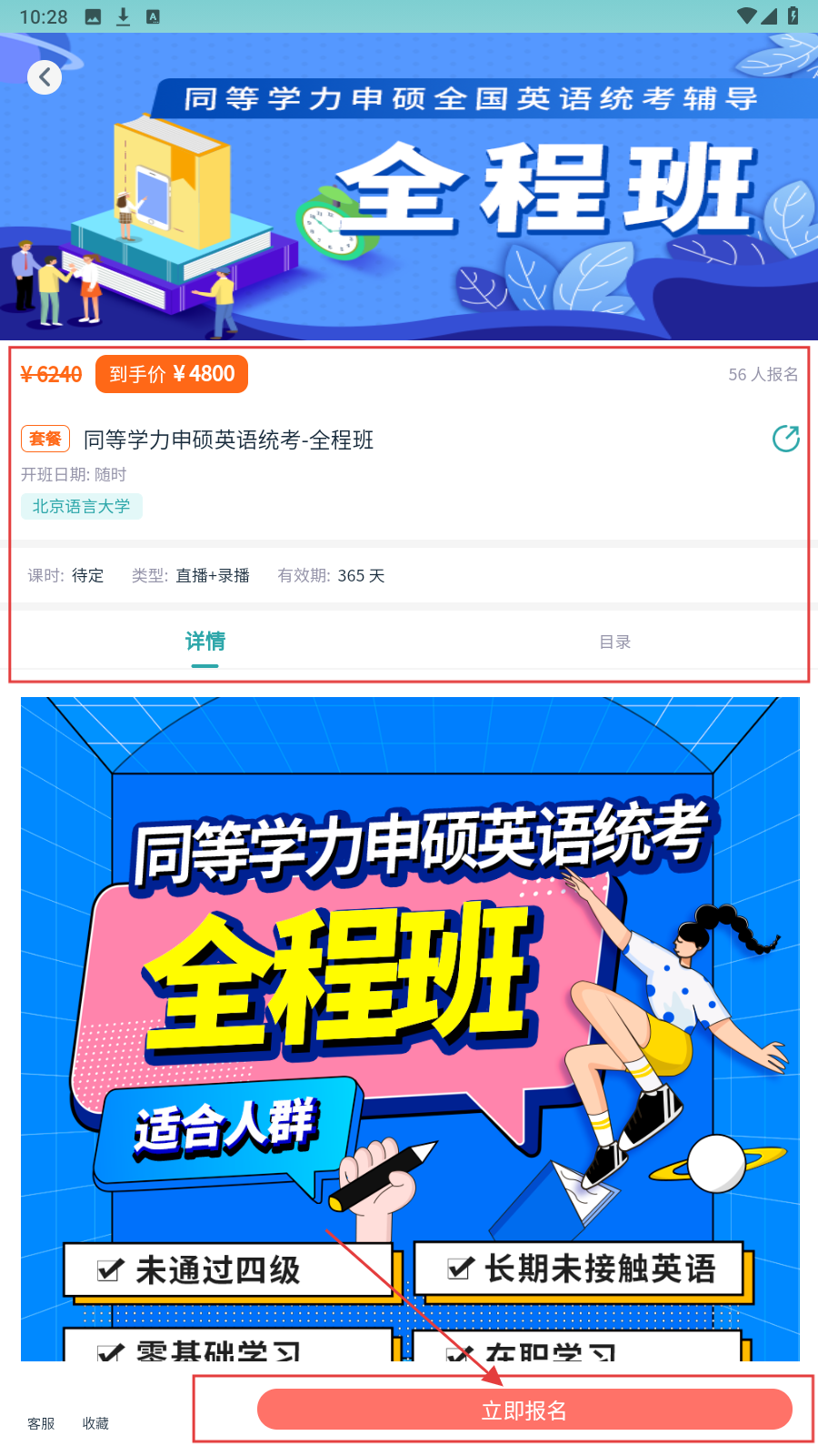 4、若需要辅导课程,可在课程介绍页面,点击【立即报名】按钮,报名【同等学力申硕英语统考-全程班】,助力考试备考。