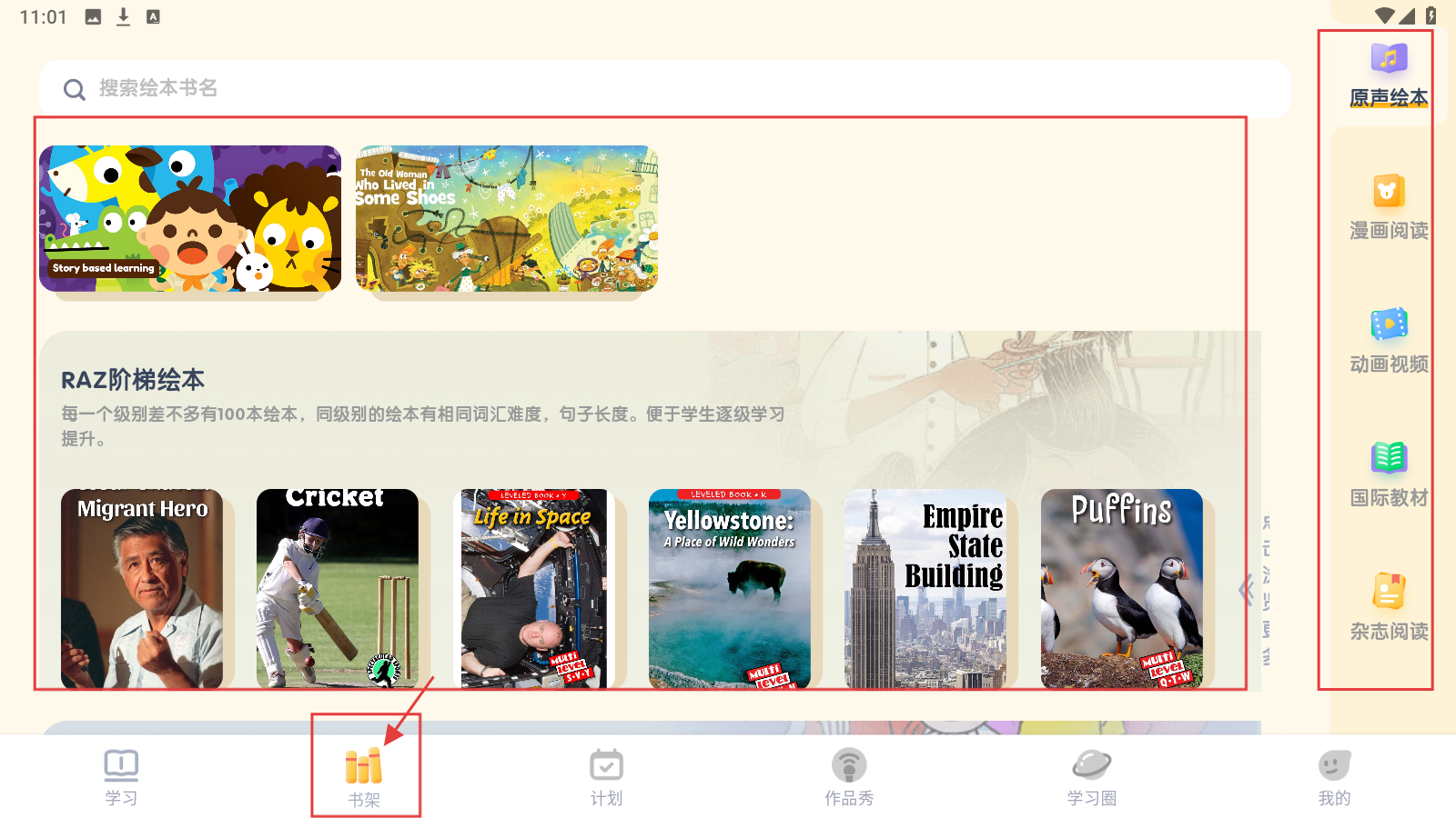 1、在主界面,可选择【书架】,查看已有的绘本资源,还可浏览【RAZ阶梯绘本】等分类。