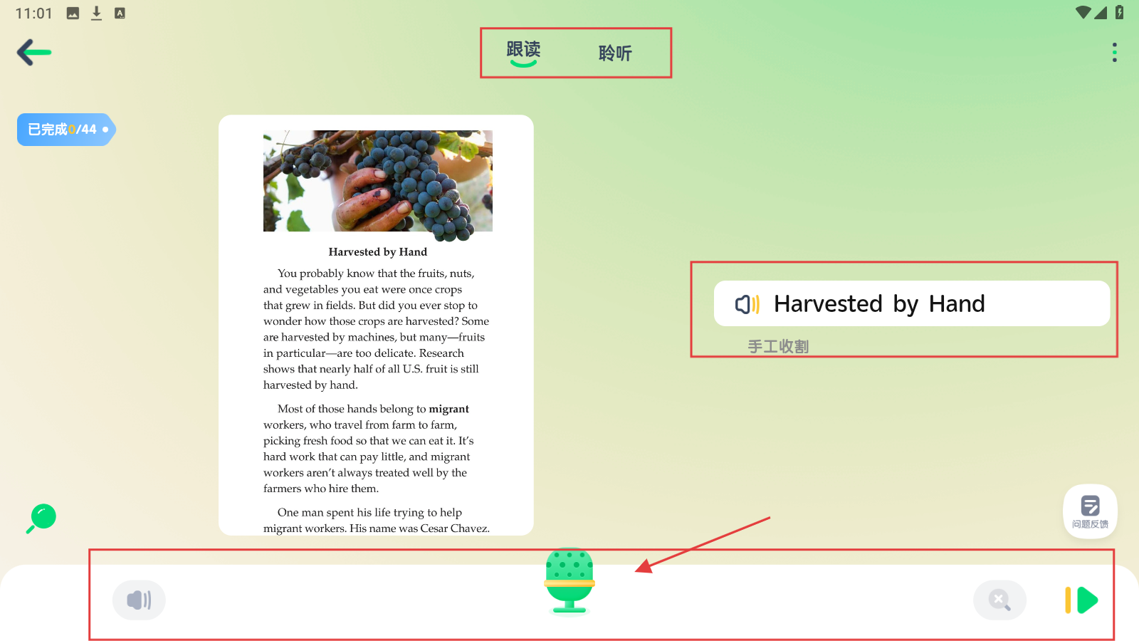 2、在绘本阅读页面,可选择【跟读】或【聆听】模式,点击麦克风图标进行跟读练习。