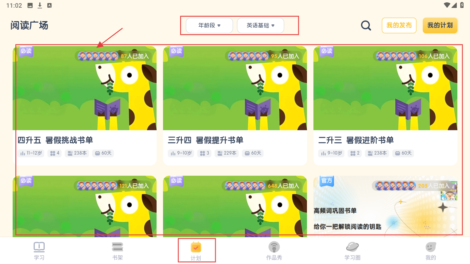 3、在【阅读广场】,可根据【年龄段】和【英语基础】筛选书单,找到适合自己的阅读计划。