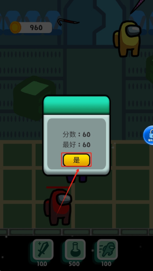 4、结算成绩:当屏幕显示“960 分数:60 最好:60 是 00”时,点“是”保存成绩并返回大厅。