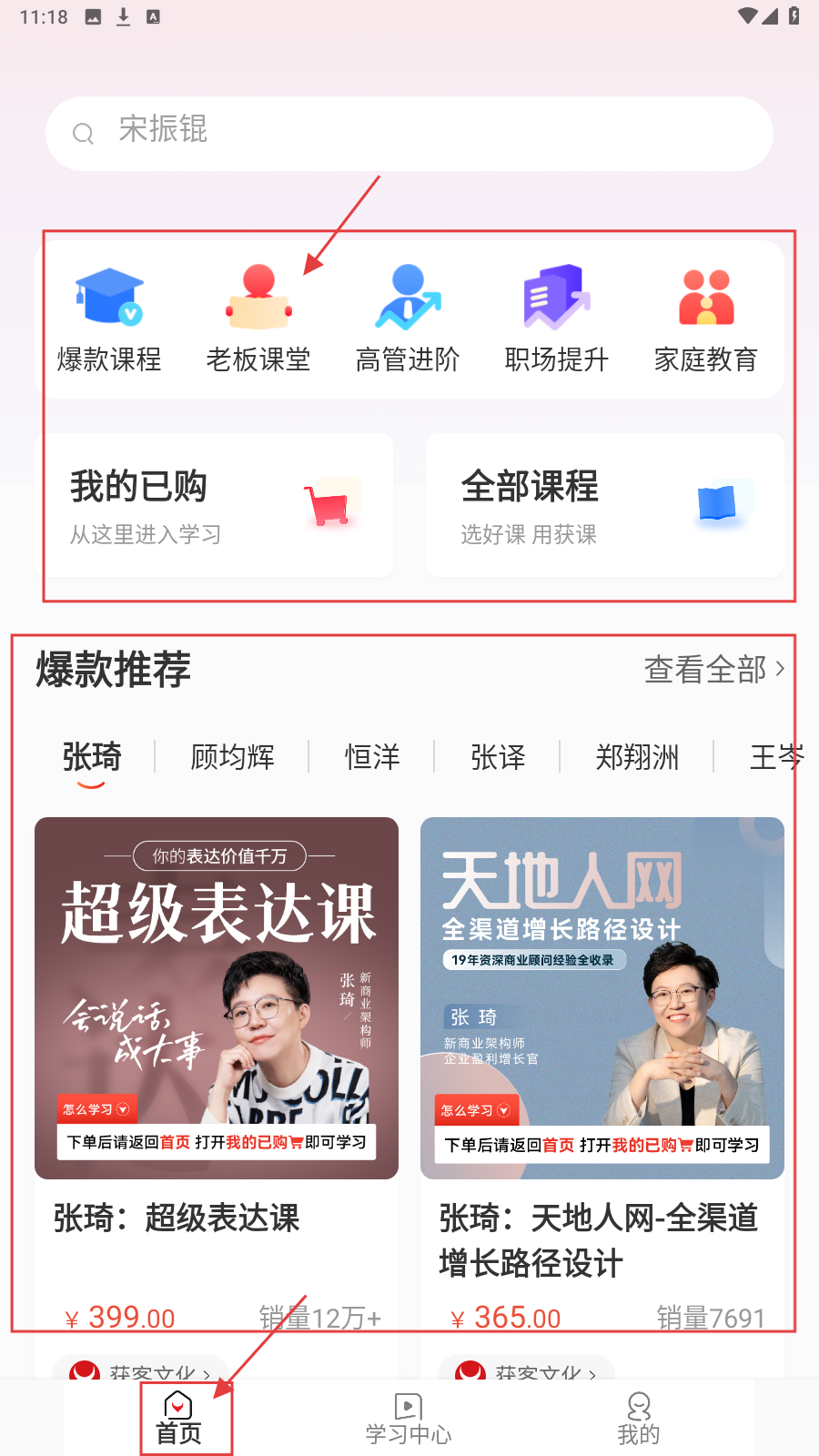 1、在【首页】界面,可选择【爆款课程】【老板课堂】等分类,浏览丰富的课程资源。