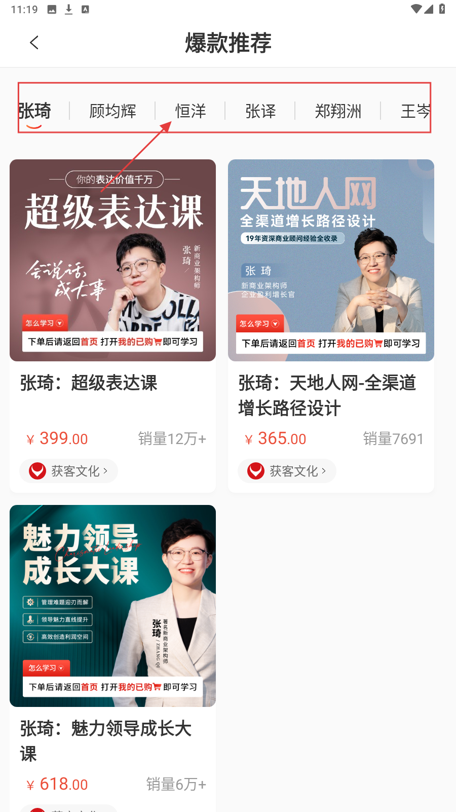 4、在【爆款推荐】界面,可选择不同讲师,查看其课程,选择适合自己的课程进行学习。