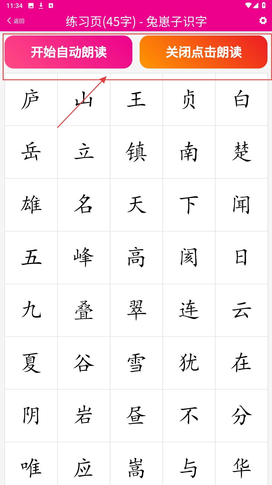 1、在【练习页(45字)-兔崽子识字】界面,可点击【开始自动朗读】按钮,开启自动朗读功能,帮助学习汉字发音。