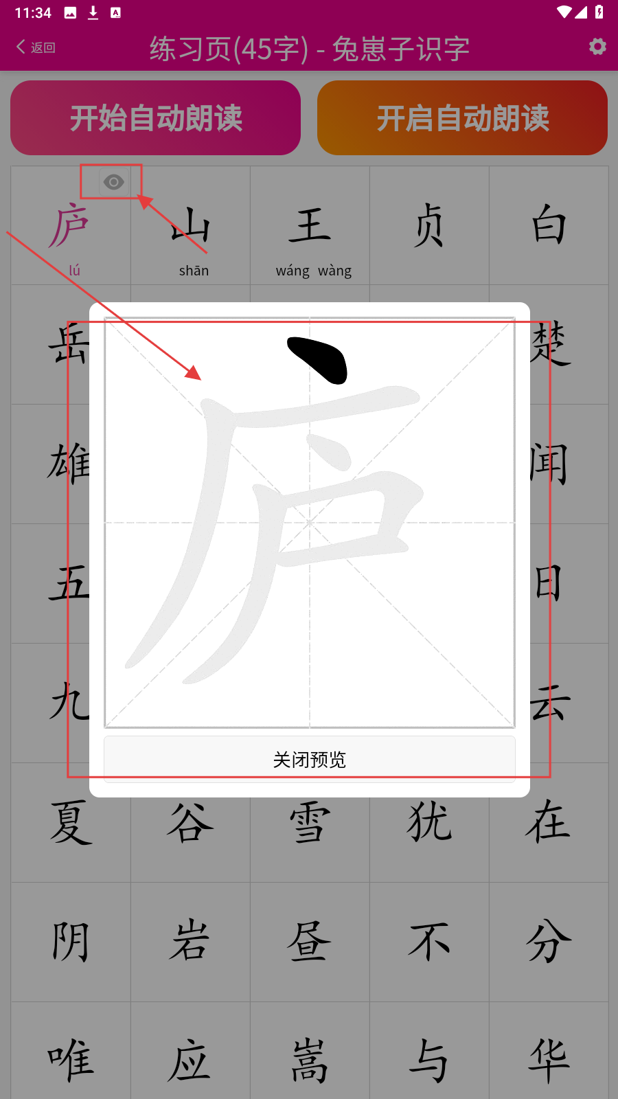 2、点击汉字右上方的眼睛图标,可查看其书写笔顺和拼音,深入学习汉字知识。