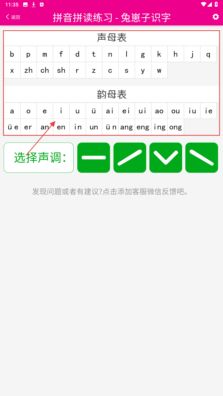 3、在【拼音拼读练习-兔崽子识字】界面,可查看【声母表】和【韵母表】,学习拼音知识。