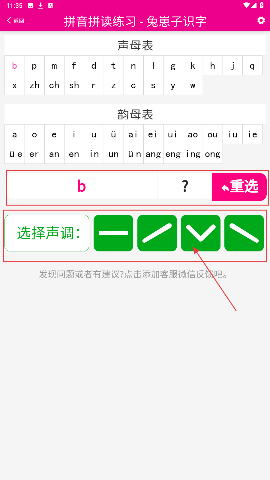 4、选择声母和韵母后,可点击【选择声调】按钮,选择正确的声调,完成拼音拼读练习。
