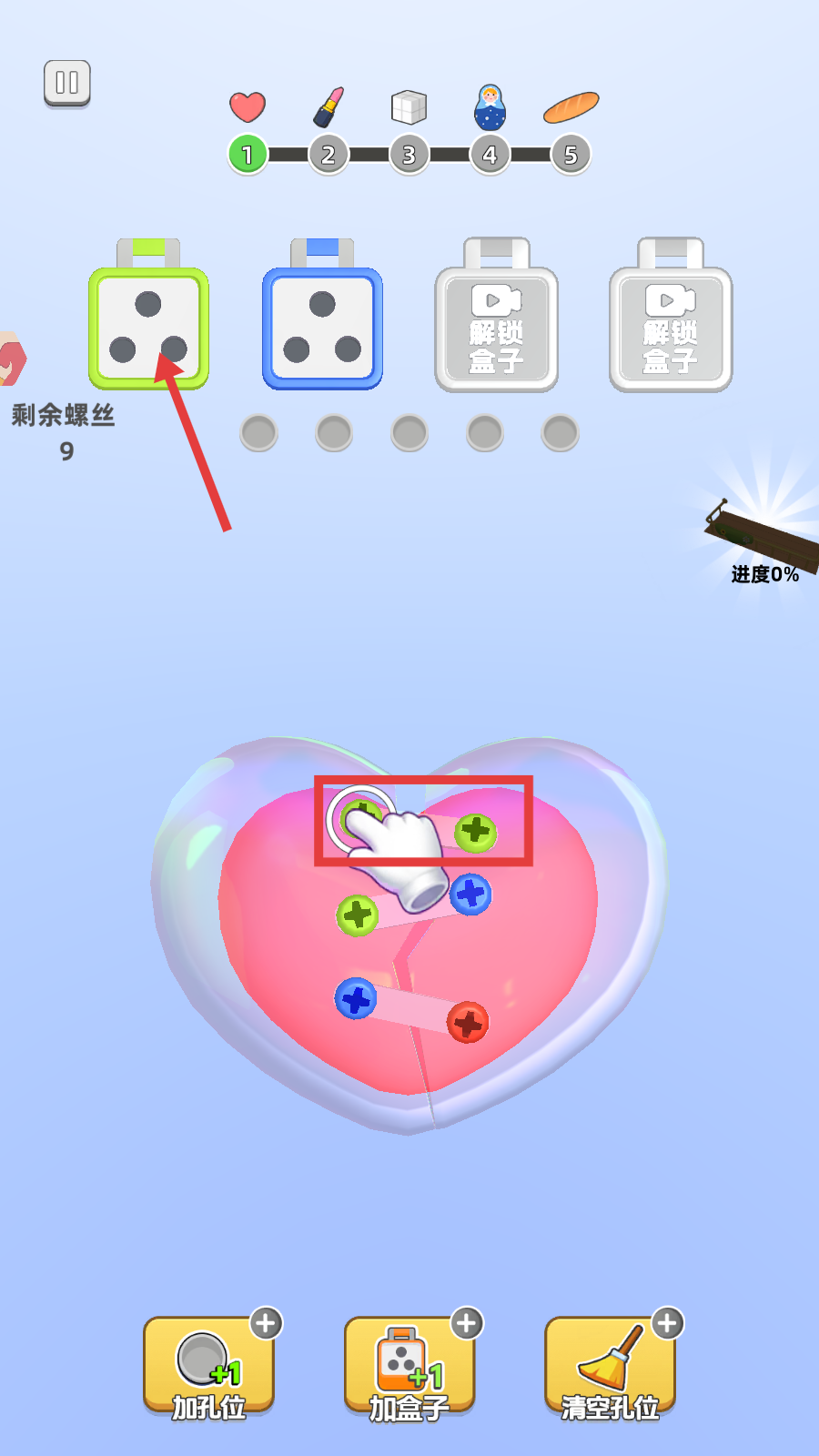 1、可以通过点击【螺丝】,螺丝自动被螺掉,放置在相同螺丝盒里面,拆掉剩余9个螺丝为止。