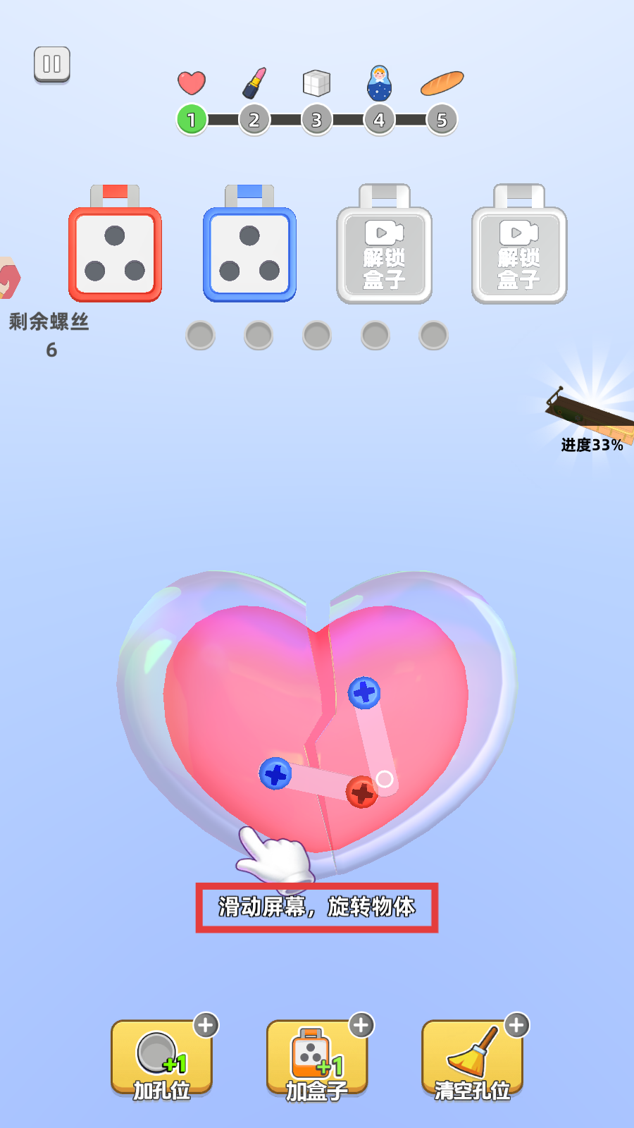 2、按【滑动屏幕,旋转物体】提示,可以发现【心】的背部也有螺丝没解开。