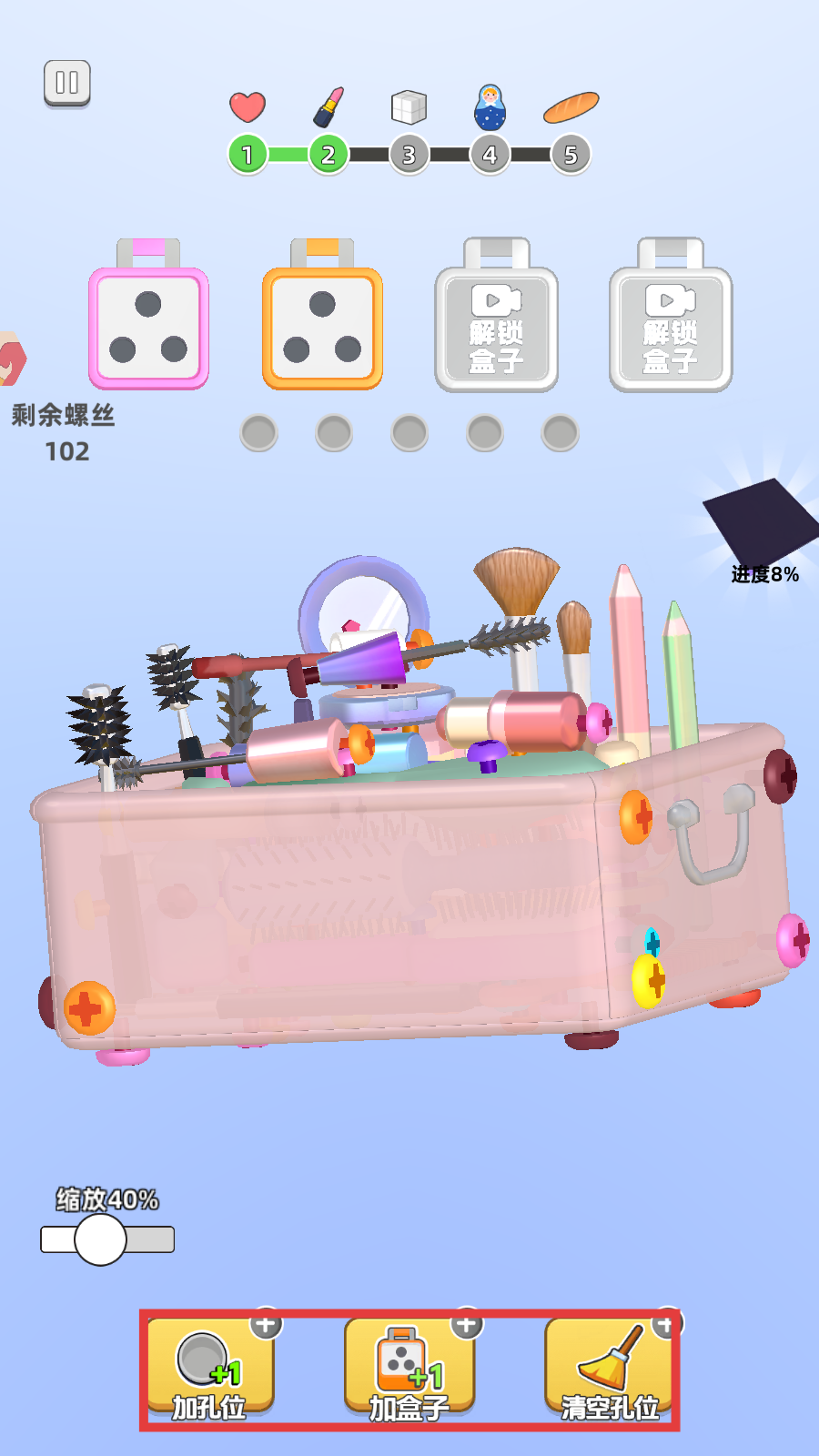 3、在面对复杂的螺丝物件,可以用【加孔位】【加盒子】【清空孔位】功能,提升解开螺丝的难度。