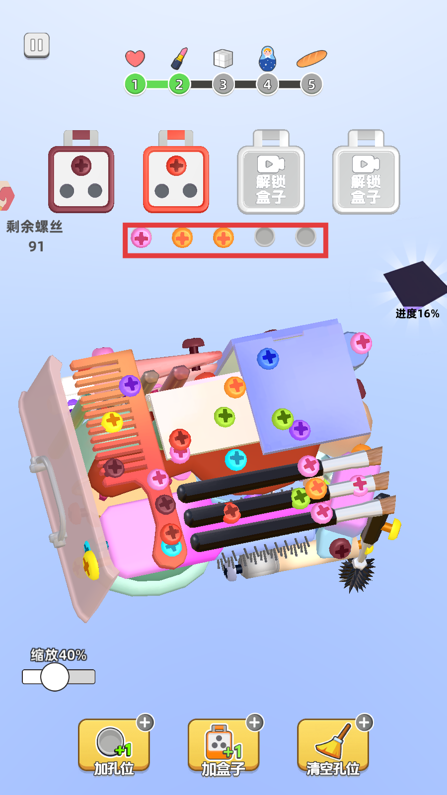 4、实在无法解开3个相同颜色螺丝凑成一对消失,可以先解开放置中间,搁置在那,方能解开所有物件螺丝。