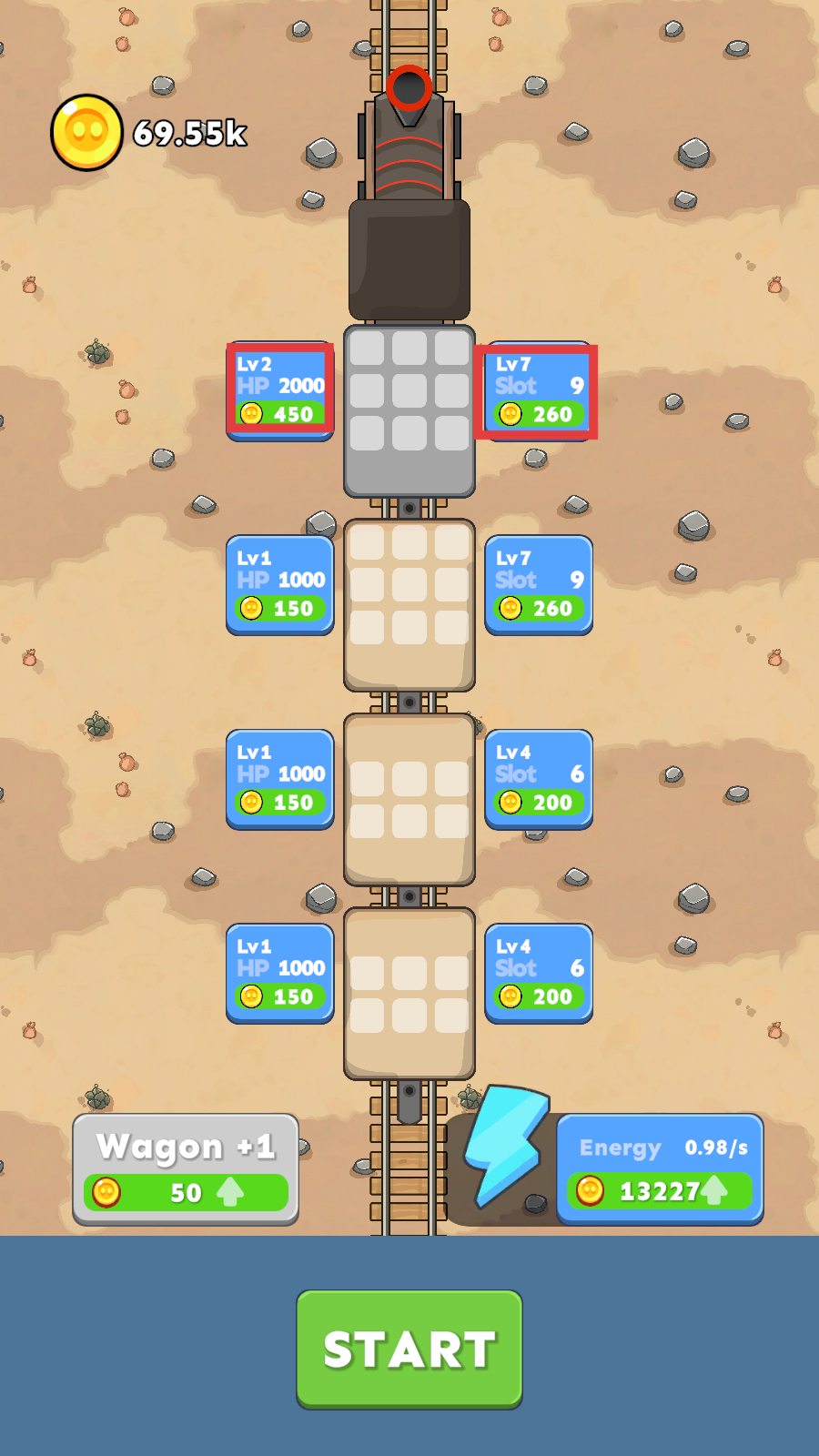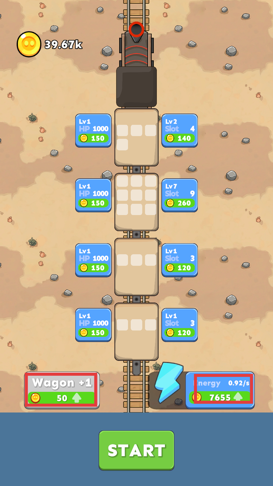 1、可以通过下方,左边按键【Wagon+1】增加产出金币的个数,右边按键【Erengy】增加获取金币的速度,加快通关的基础。