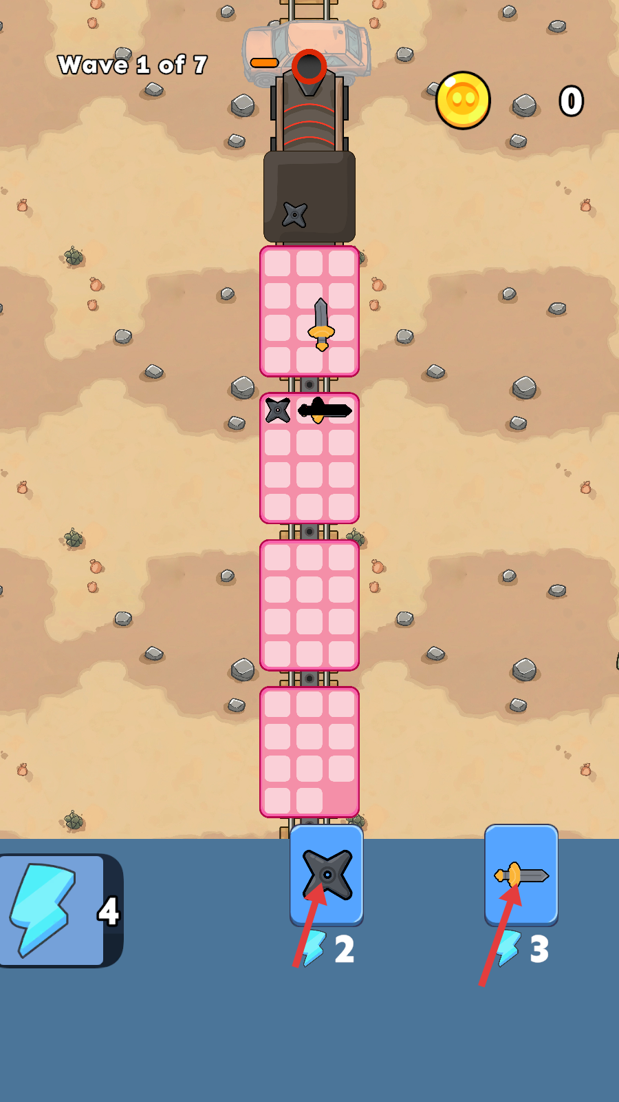 1、武器拖拽部署:自由放置各类武器至车厢空格,不同攻击类型形成互补效果覆盖远近目标提升防御效率。