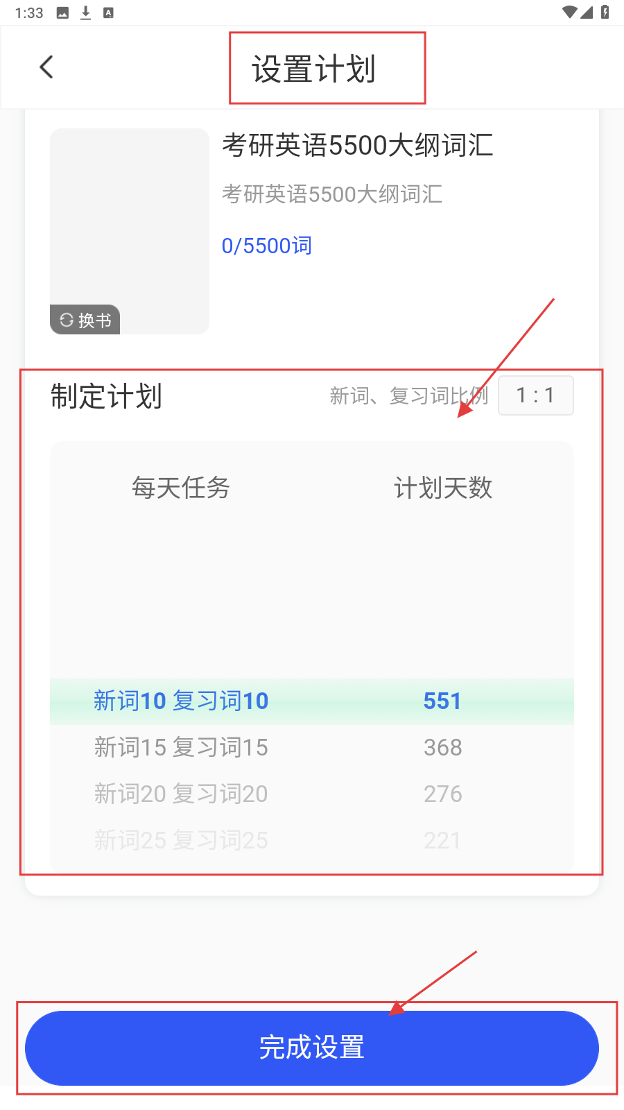 1、打开应用,在【设置计划】页面自己制定计划,制定好后点击下方【完成设置】。