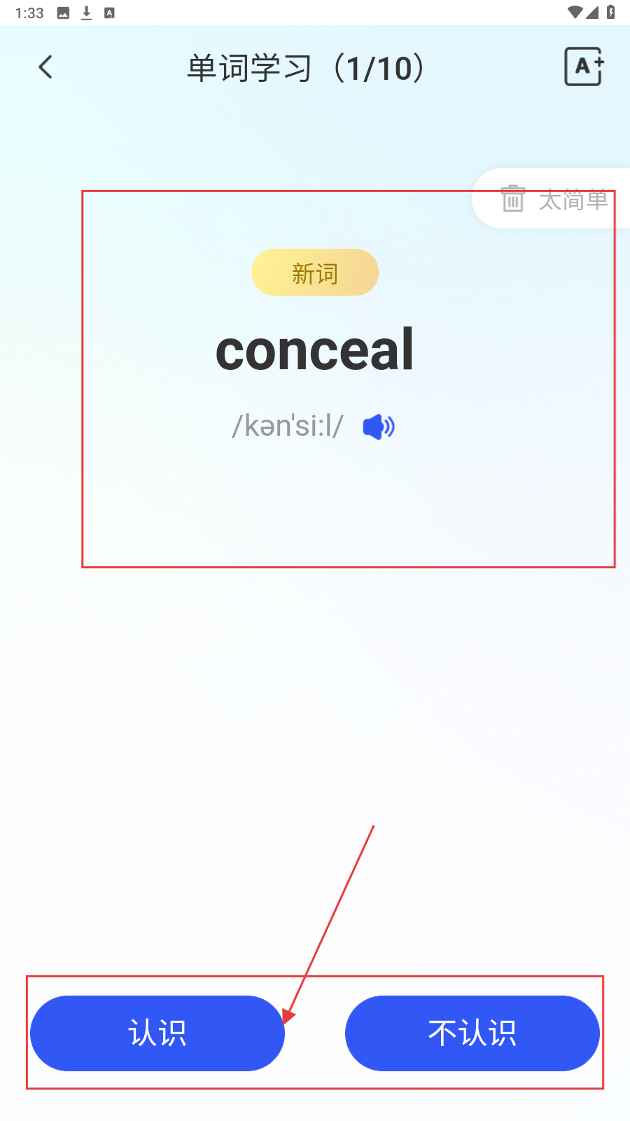 3、进入【单词学习】页面,可以进行听读单词,选择下方【认识】或【不认识】按钮。