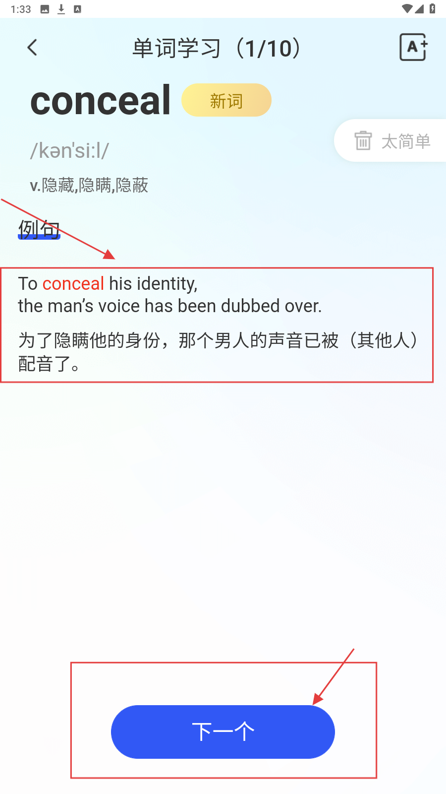 4、选择完成即可查看单词意思及例句,学会后点击【下一个】即可继续学习单词。