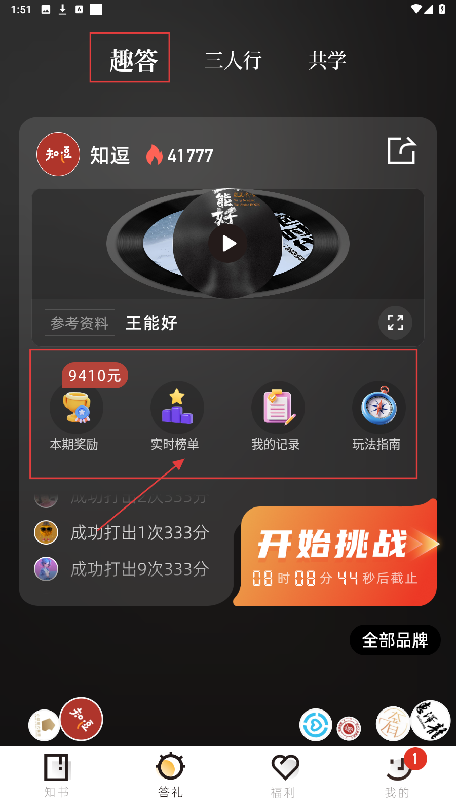 3、在【答礼】页面中,选择【趣答】后,点击下方的【玩法指南】。